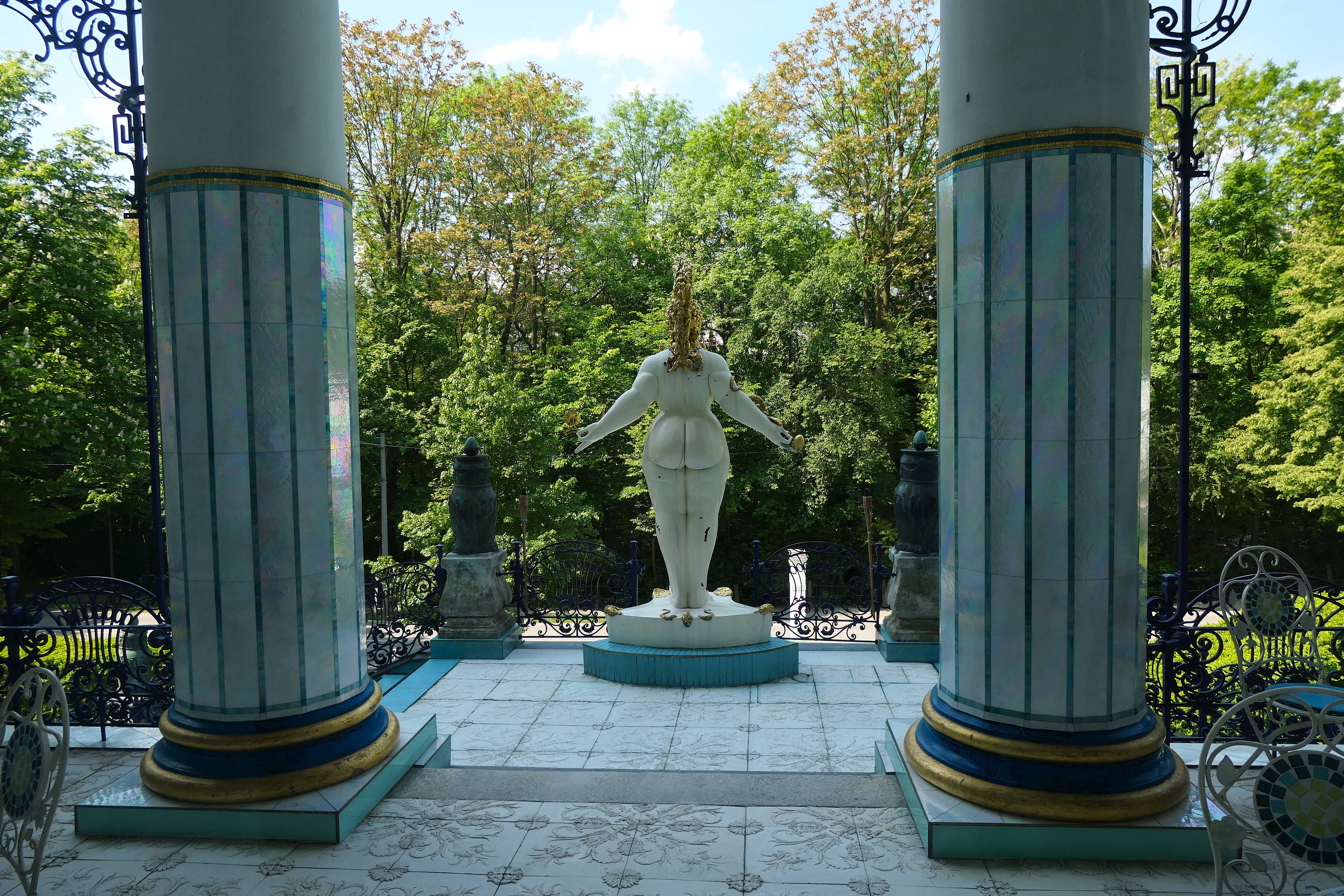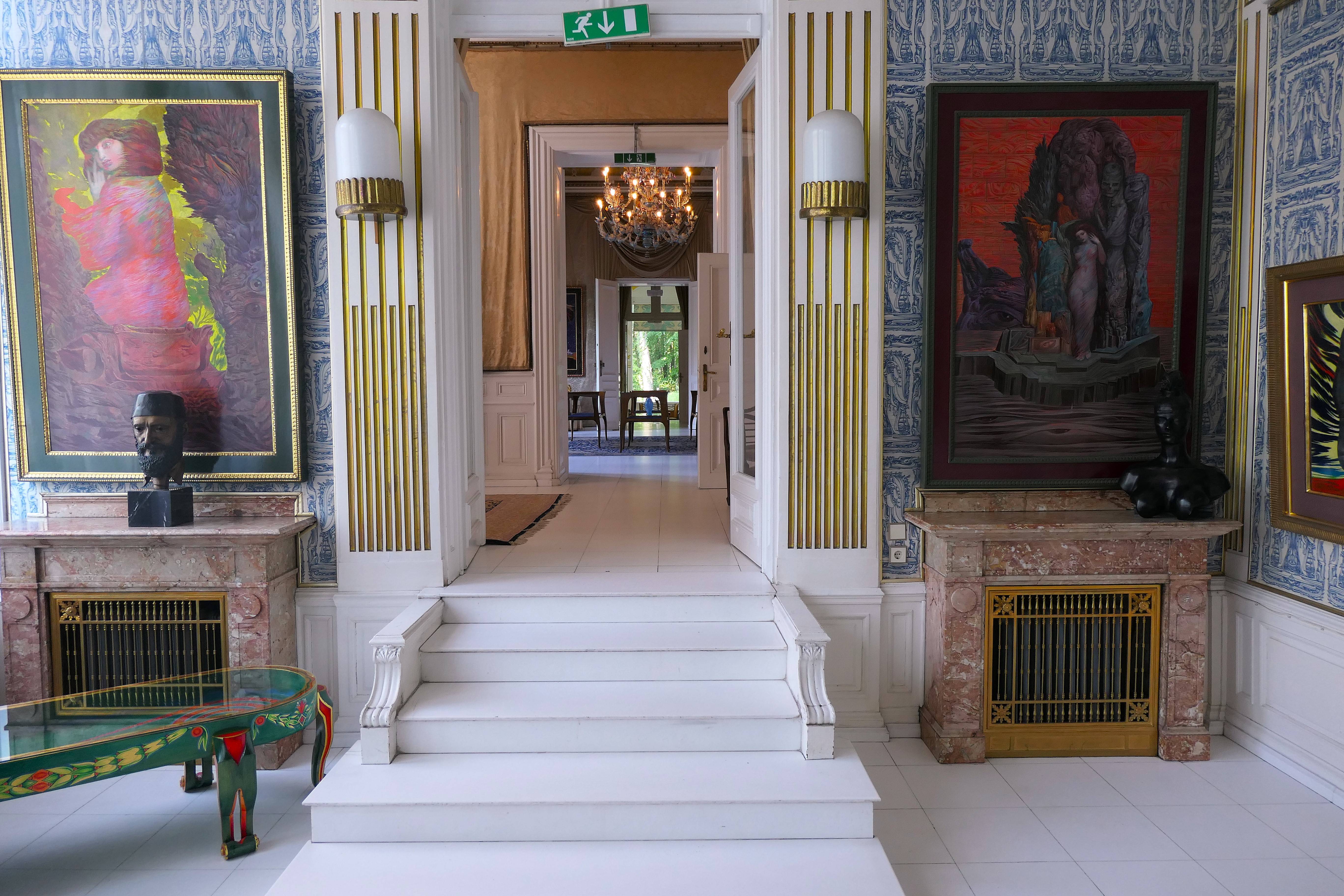 Natürlich bewahrt das Haus nicht nur die Spuren Otto Wagners, auch Ernst Fuchs hat ihm kräftig seinen Stempel aufgedrückt – am augenfälligsten wohl im Garten mit dem pompösen Brunnenhaus „Nymphäum Omega“, dem vorgelagerten Moses-Brunnen und der zwischen den ionischen Säulen thronenden Esther-Figur, deren füllige Formen an die Venus von Willendorf erinnern. Für Fuchs war sie „die Urmutter schlechthin“. Im Innern stammen Tapeten, Möbel und zahlreiche großformatige Gemälde von Fuchs. Die elegante Ornamentik und Klarheit der Wiener Secession bilden den dezenten Rahmen für die schreiend bunte Bilderwelt des Ernst Fuchs.