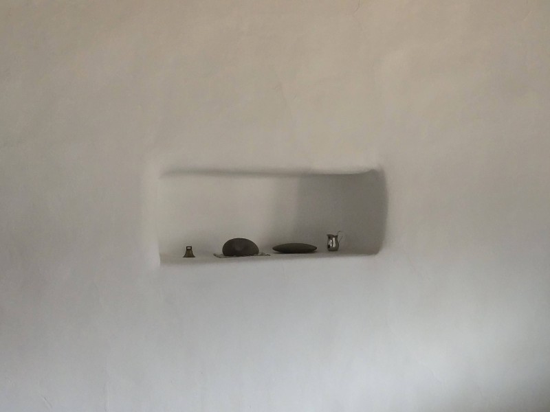 Sie ließ das Haus nach ihren Vorstellungen umgestalten. Große Fensterflächen sollten den Blick in die Umgebung öffnen, die Natur wurde gleichsam in das Wohnen hineingenommen. Ihr Atelier nahm den größten Raum ein, daneben lag ihr Schlafzimmer – beide abgetrennt vom restlichen Wohnbereich. Das gesamte Interieur mit den weiß verputzten Wänden und den modernen Möbeln von Charles und Ray Eames, Harry Bertoia, Eero Saarinen wirkt klar und minimalistisch. An der Decke ließ O‘Keeffe ein Mobile von Alexander Calder anbringen und im Esszimmer die einzige Lampe vom befreundeten Isamu Noguchi. Ansonsten bevorzugte sie nackte Glühbirnen. An den Wänden wollte sie auf ihre eigenen Werke blicken und sich mit sorgfältig arrangierten Fundstücken aus der Wüstenlandschaft – ausgebleichte Tierknochen, Geweihe, Holzstücke, Steine – umgeben. „Ich nutze diese Dinge um darzustellen, was mir die Weite und die Wunder der Welt, in der ich lebe und wie ich sie erlebe, bedeuten.“