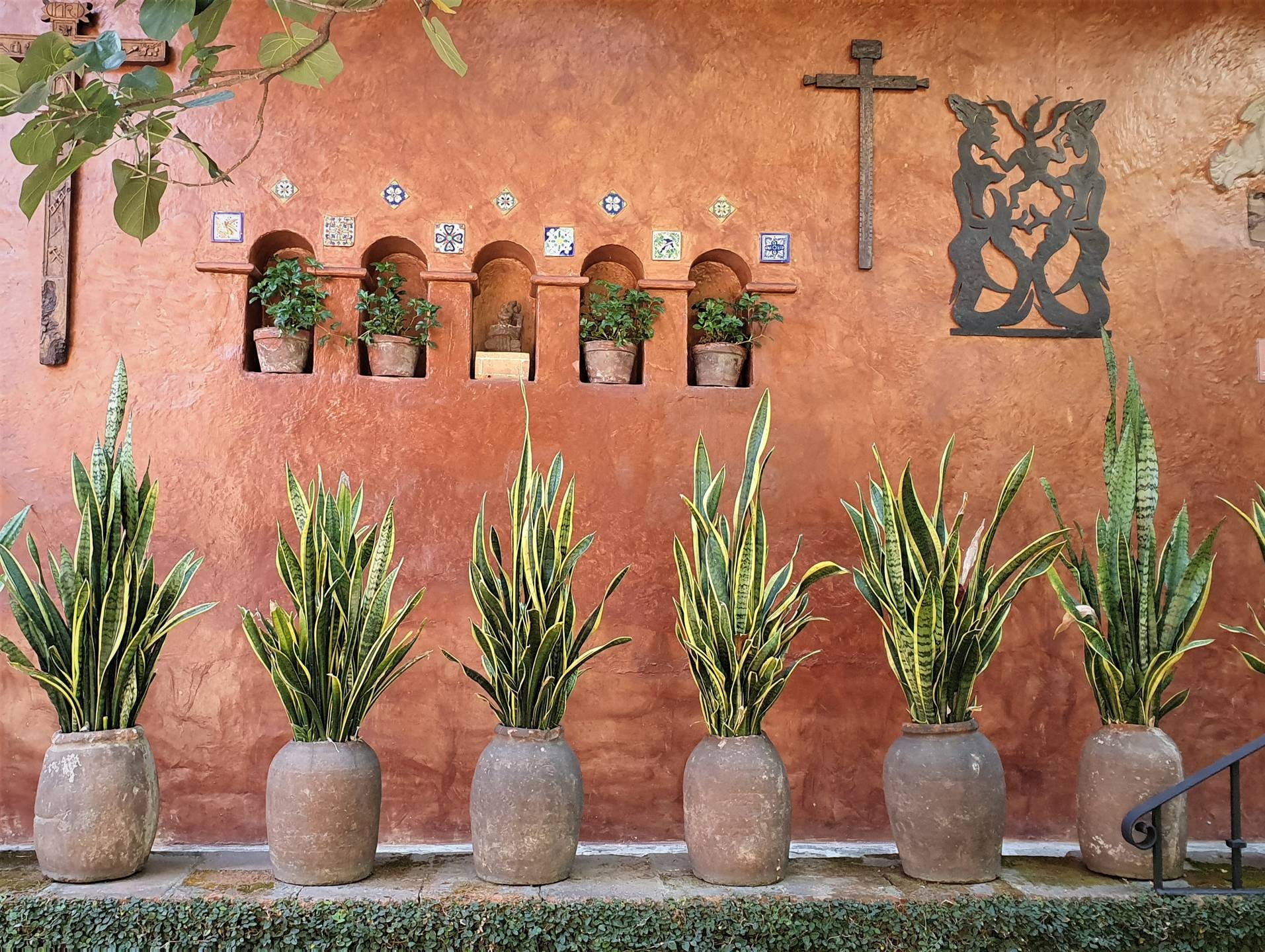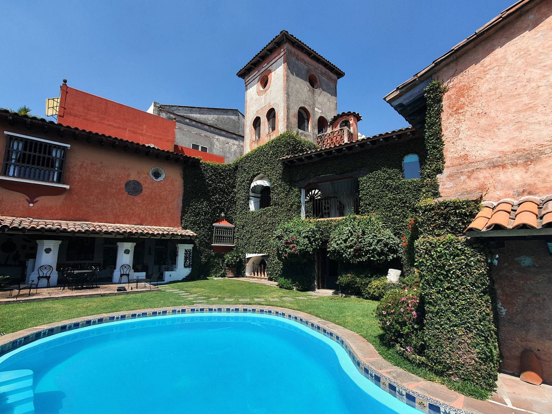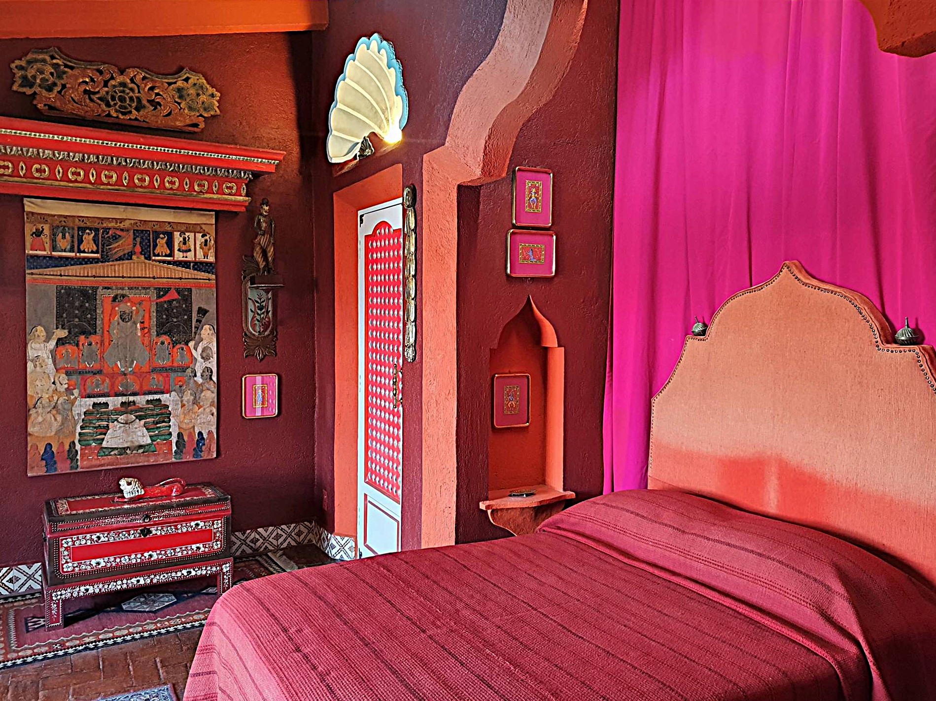 Alle Räume haben durch eine jeweils besondere Farbgebung ihren eigenen Charakter und ihr eigenes thematisches Zentrum. Da gibt es die mit mexikanischer Handwerkskunst dekorierte Hausbar, die Küche und die Badezimmer, allesamt mit wunderbaren handgefertigten Kacheln ausgestattet, oder neben dem Pool das Terrassenzimmer mit einer fulminanten ethnografischen Sammlung. Eine steinerne Außentreppe führt ins Obergeschoss zum „Gelben Zimmer“ und zu den in lasziven Rot- und Orangetönen gehaltenen Schlafzimmern.