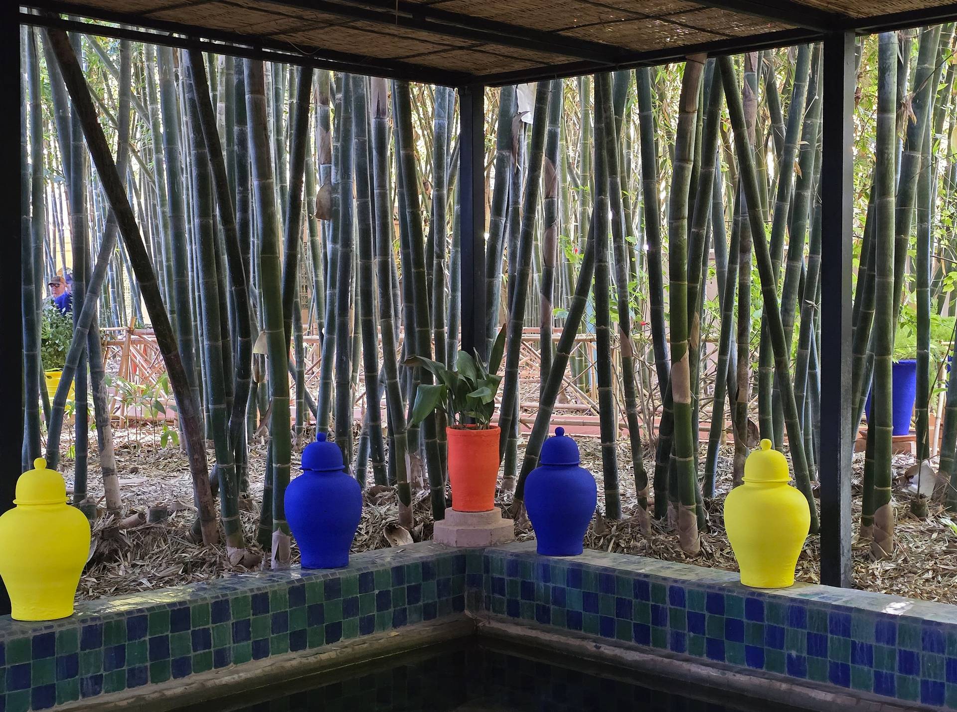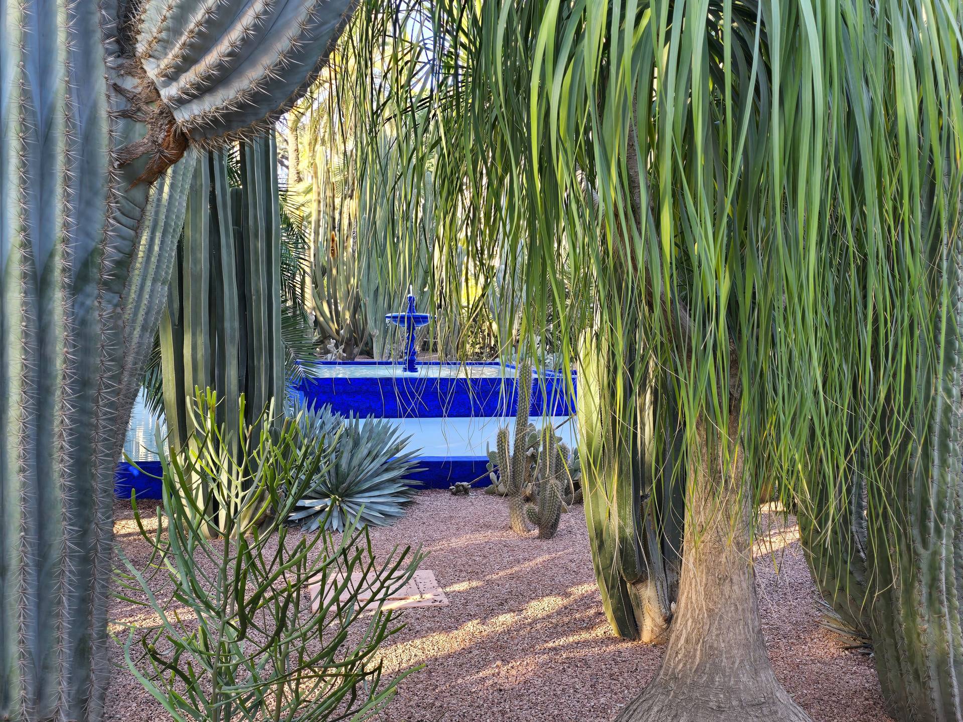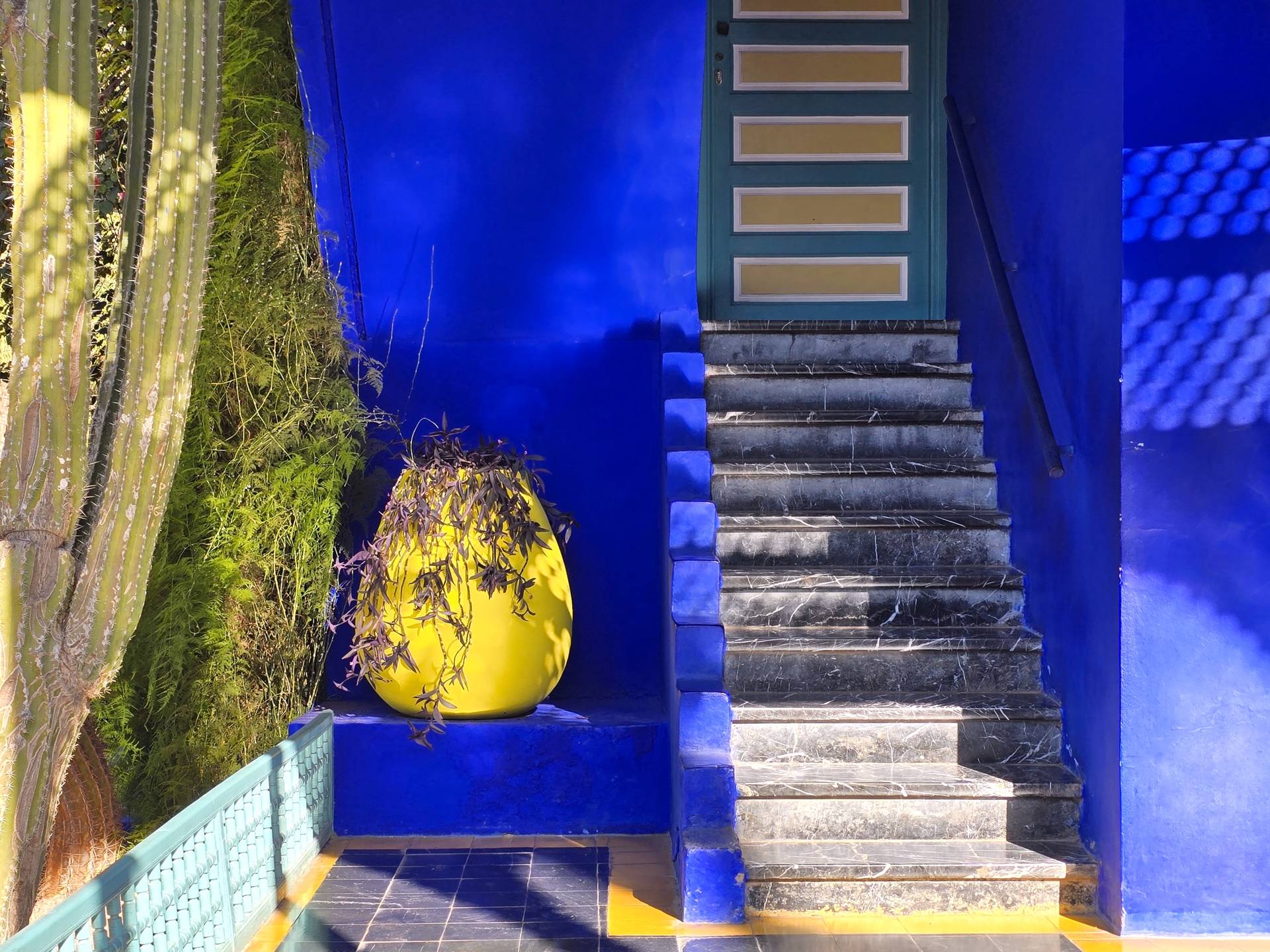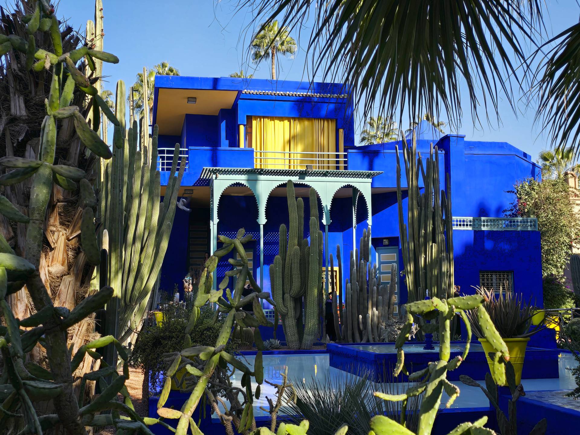 Jacques Majorelle, Sohn des berühmten Jugendstildesigners Louis Majorelle, hatte 1923 in seiner Wahlheimat Marrakesch das Grundstück erworben, den Garten angelegt und ein Wohnhaus im maurischen Stil errichtet. Einige Jahre später beauftragte er den Architekten Paul Sinoir mit dem Bau eines separaten Ateliers in modernen kubischen Formen. Die Fassade dieses Pavillons ließ er in einem tiefen Kobaltblau streichen – dem sogenannten „Bleu Majorelle“, angelehnt an die traditionelle Farbe der Berber. Dieses Blau leuchtet immer wieder magisch durch das üppige Grün von Palmen, Bambus und Kakteen. Farbkräftige Bougainvilleen und gelbe Terrakotta-Töpfe setzen weitere Akzente, während Wasserkanäle, Bassins und Brunnen dem Ensemble eine lebendige Frische verleihen.