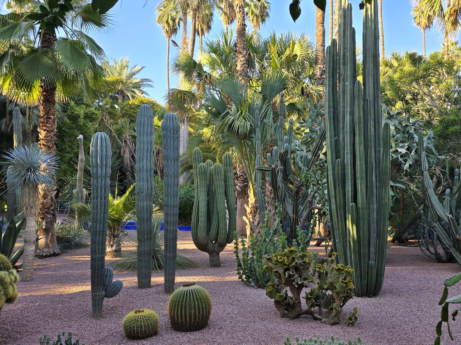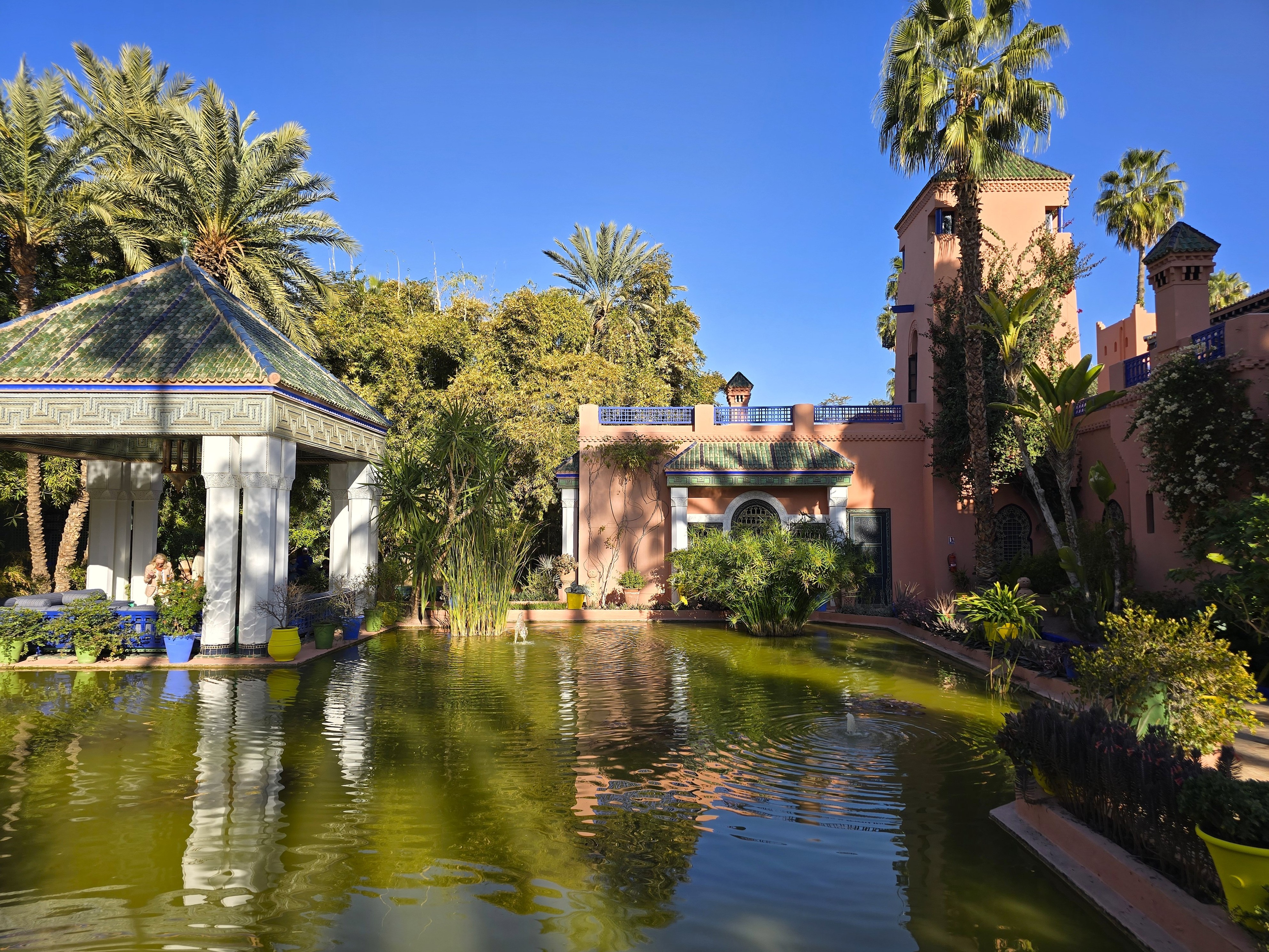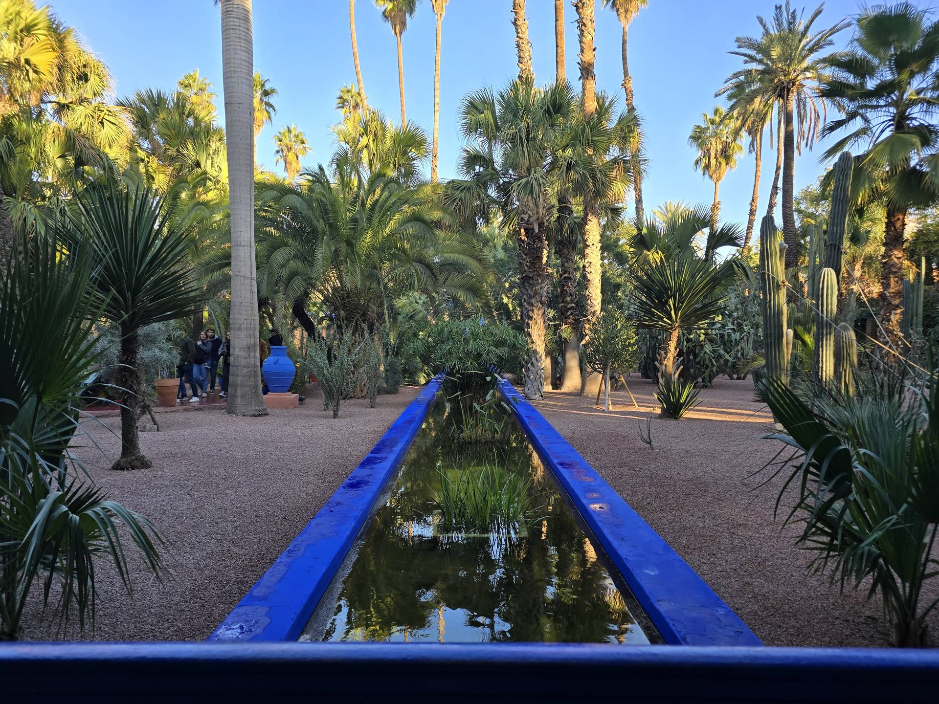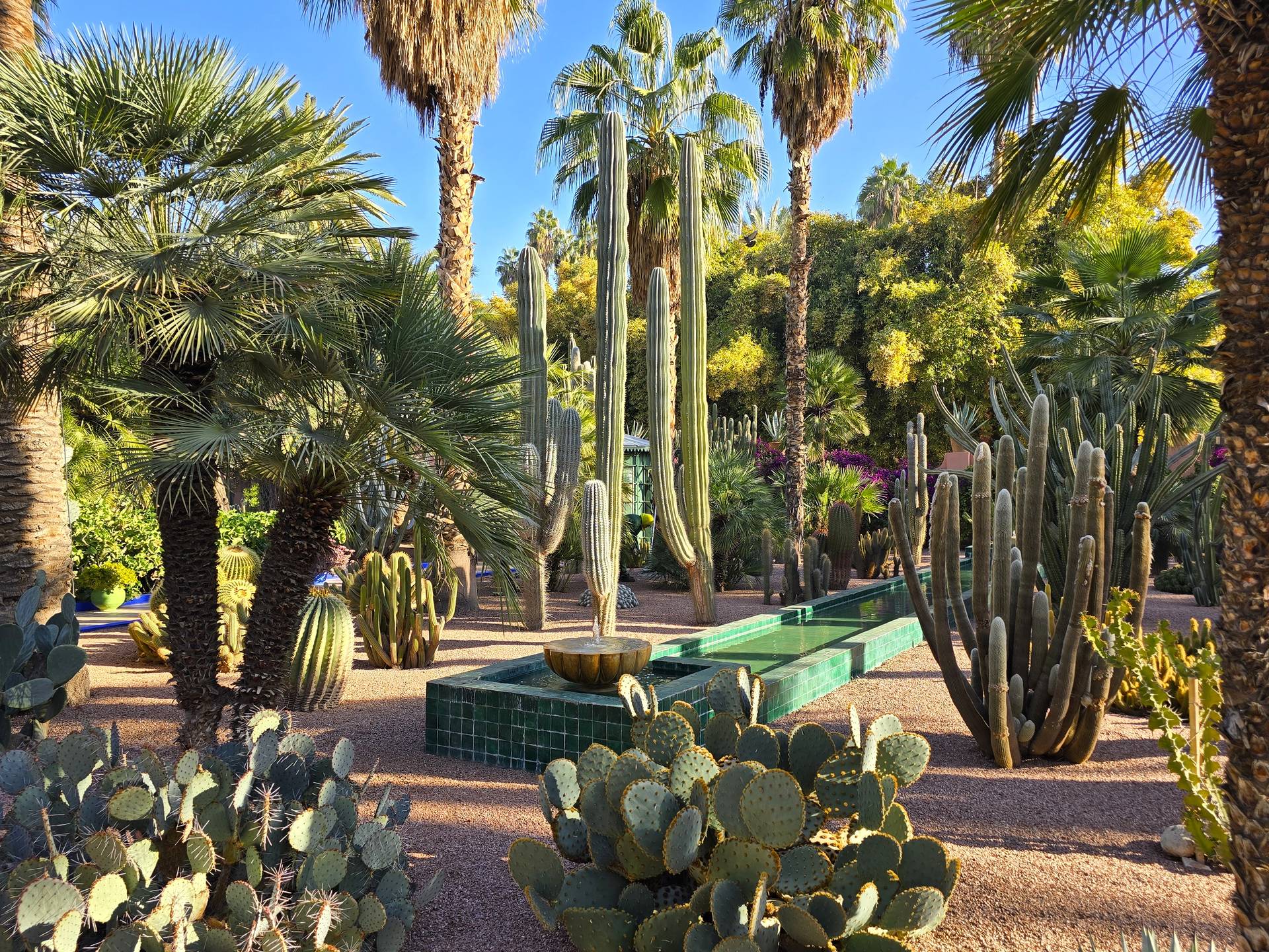 Jacques Majorelle, Sohn des berühmten Jugendstildesigners Louis Majorelle, hatte 1923 in seiner Wahlheimat Marrakesch das Grundstück erworben, den Garten angelegt und ein Wohnhaus im maurischen Stil errichtet. Einige Jahre später beauftragte er den Architekten Paul Sinoir mit dem Bau eines separaten Ateliers in modernen kubischen Formen. Die Fassade dieses Pavillons ließ er in einem tiefen Kobaltblau streichen – dem sogenannten „Bleu Majorelle“, angelehnt an die traditionelle Farbe der Berber. Dieses Blau leuchtet immer wieder magisch durch das üppige Grün von Palmen, Bambus und Kakteen. Farbkräftige Bougainvilleen und gelbe Terrakotta-Töpfe setzen weitere Akzente, während Wasserkanäle, Bassins und Brunnen dem Ensemble eine lebendige Frische verleihen.