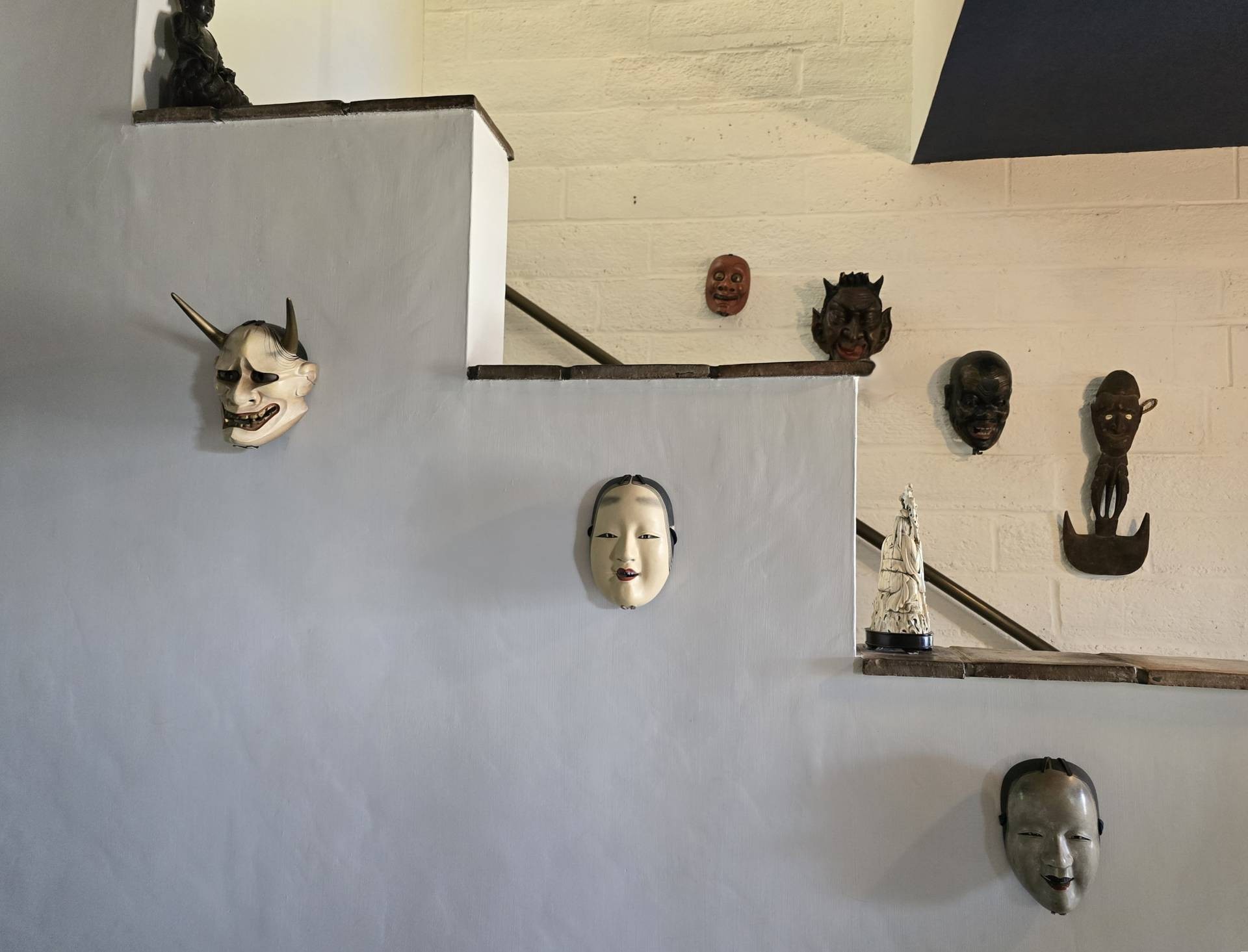 Eine Vorliebe für asiatische Philosophie und Ästhetik prägt die Außen- und Innengestaltung. Ein gezackter Weg führt zum Eingang, nach den Lehren des Feng Shui gedacht, um positive Lebensenergie – das Chi – einzufangen und das Negative abzuwehren. Die Zimmerdecken verweisen in ihren Blautönen auf die Farben des Himmels, die lehmbraunen Bodenfliesen auf die Farben der Erde. Das Mobiliar ist ostasiatisch geprägt. Und indigene Masken – wir sind im Zuhause eines Theaterautors – zieren die Wände.