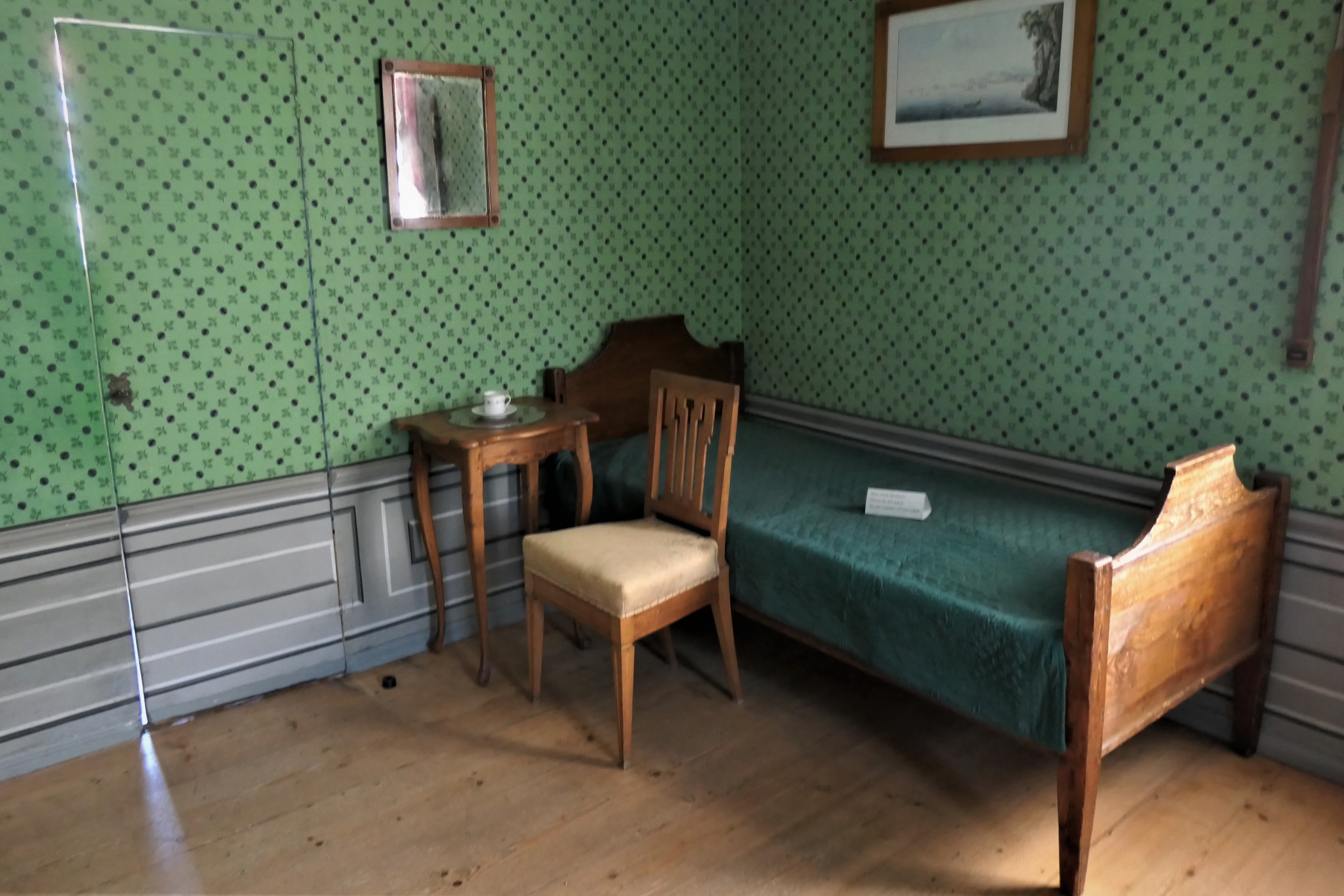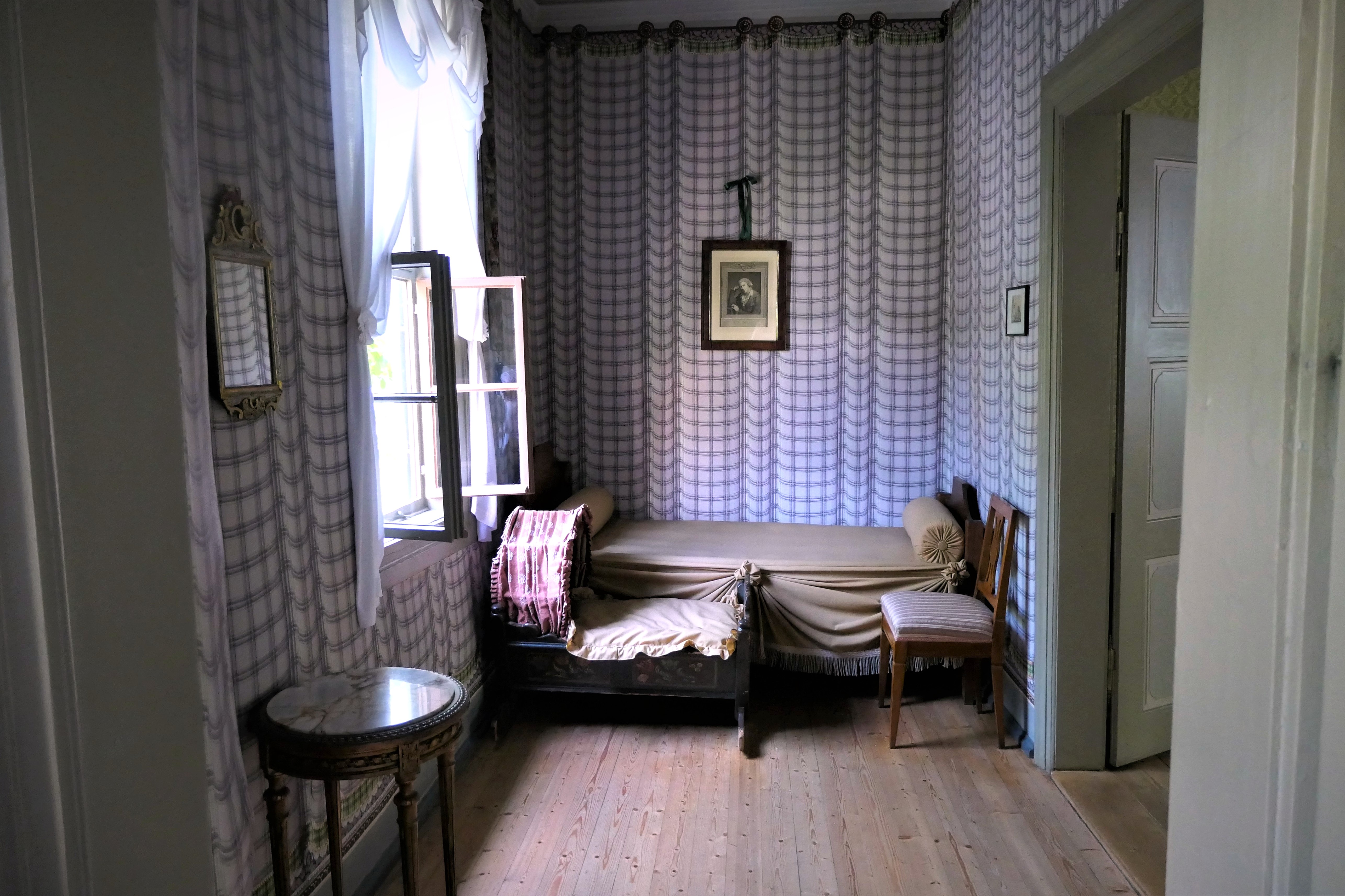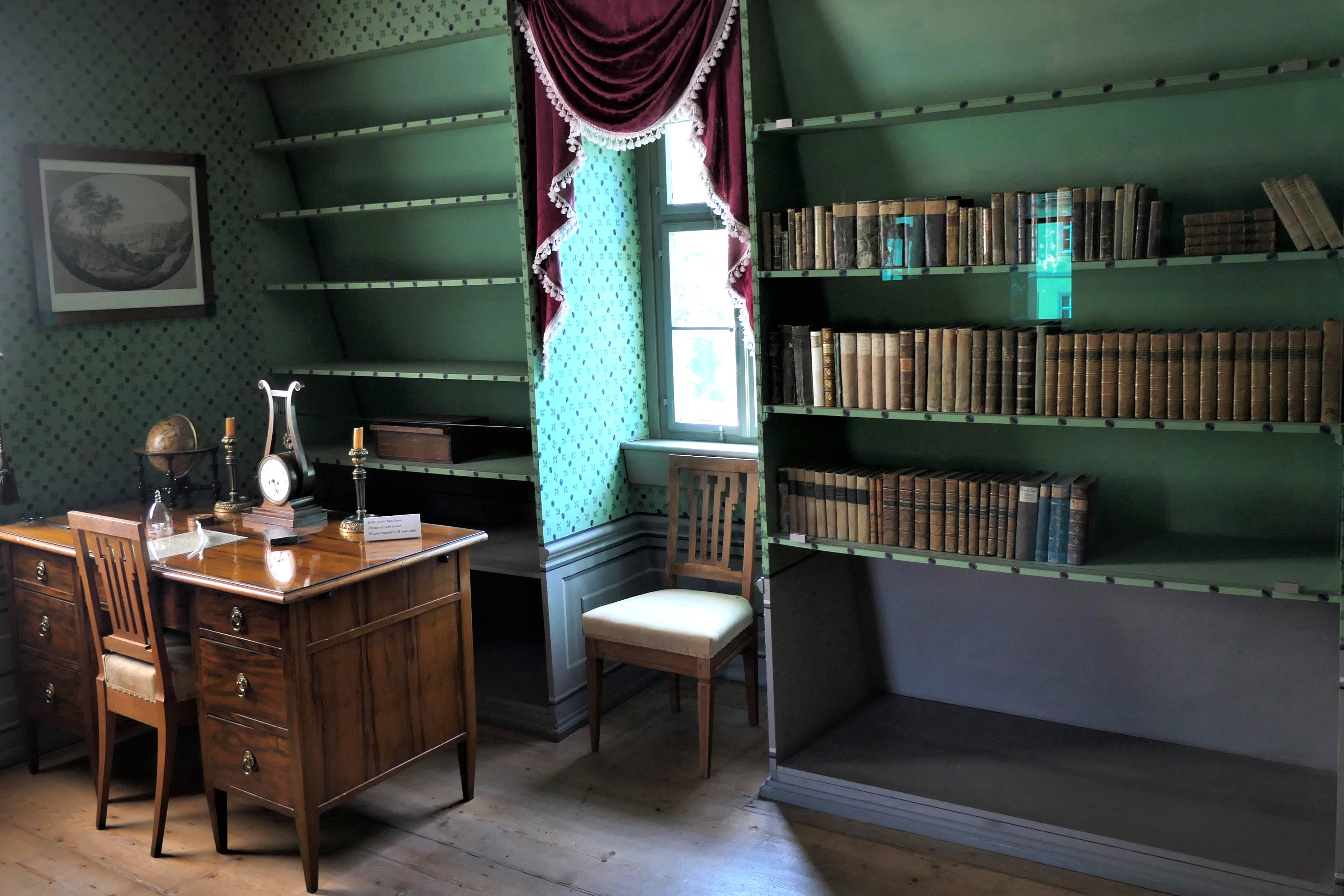 Schillers Arbeitszimmer, in dem er auch seine letzten Lebensmonate verbrachte, ist der authentischste Raum des Hauses. Während andere Zimmer mit zeitgenössischem Mobiliar ergänzt wurden, blieb hier vieles im Original erhalten. Auf dem klassizistischen Schreibtisch aus Apfelbaumholz stehen Schillers Tischuhr und Schnupftabakdose. Von Johann Peter Eckermann wissen wir von der eigentümlichen Neigung des Dichters - er benötigte zur geistigen Stimulation den Geruch faulender Äpfel, die er in seiner Schreibtischschublade zu horten pflegte. Goethe soll bei Besuchen regelmäßig die Fenster aufgerissen haben. Die grün gemusterte Papiertapete ist originalgetreu rekonstruiert. Was damals niemand ahnte: Die grüne Farbe, in der sich bei Feuchtigkeit Arsen löste, dürfte Schillers ohnehin angeschlagene Gesundheit zusätzlich belastet haben - ein bitterer Kontrast zu seinem Lob der „Annehmlichkeiten einer bequemen und gesunden Wohnung.“