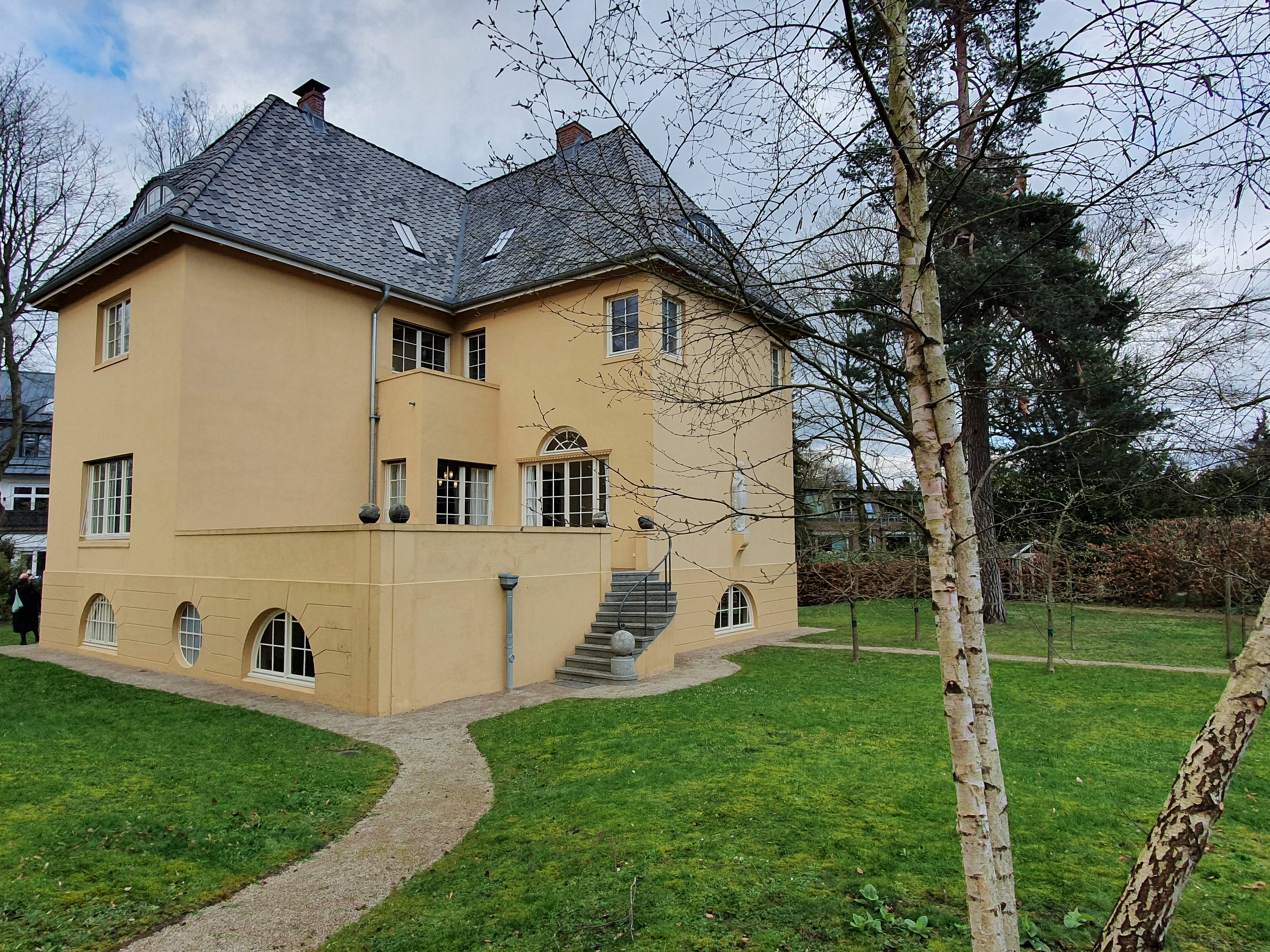 Das Speise-, das Wohn- und Dehmels Arbeitszimmer sind noch heute original erhalten. Dehmel hatte die Möbel, inspiriert von den Jugendstil-Architekten Peter Behrens und Henry van de Velde, größtenteils selbst entworfen. Die Tapeten stammen von Emil Orlik. Im Äußeren weisen die gewinkelten Baukörper und die über Eck verlaufenden Fenster bereits in die Moderne. Das steile Dach und die ockergelbe Fassade erinnern an Goethes Wohnstätten in Weimar. Die Südseite schmückt eine Mädchenskulptur des Bildhauers Richard Luksch.