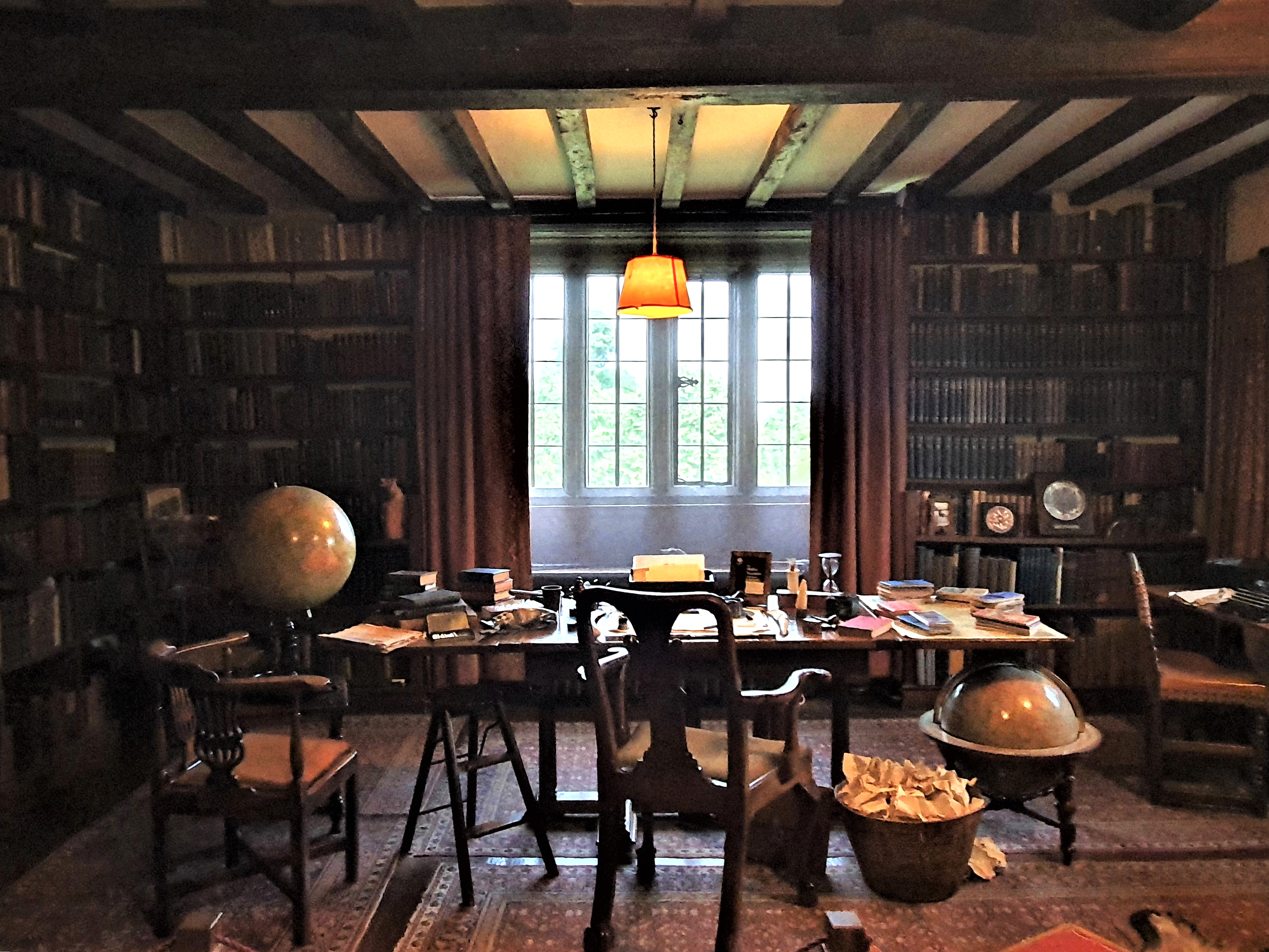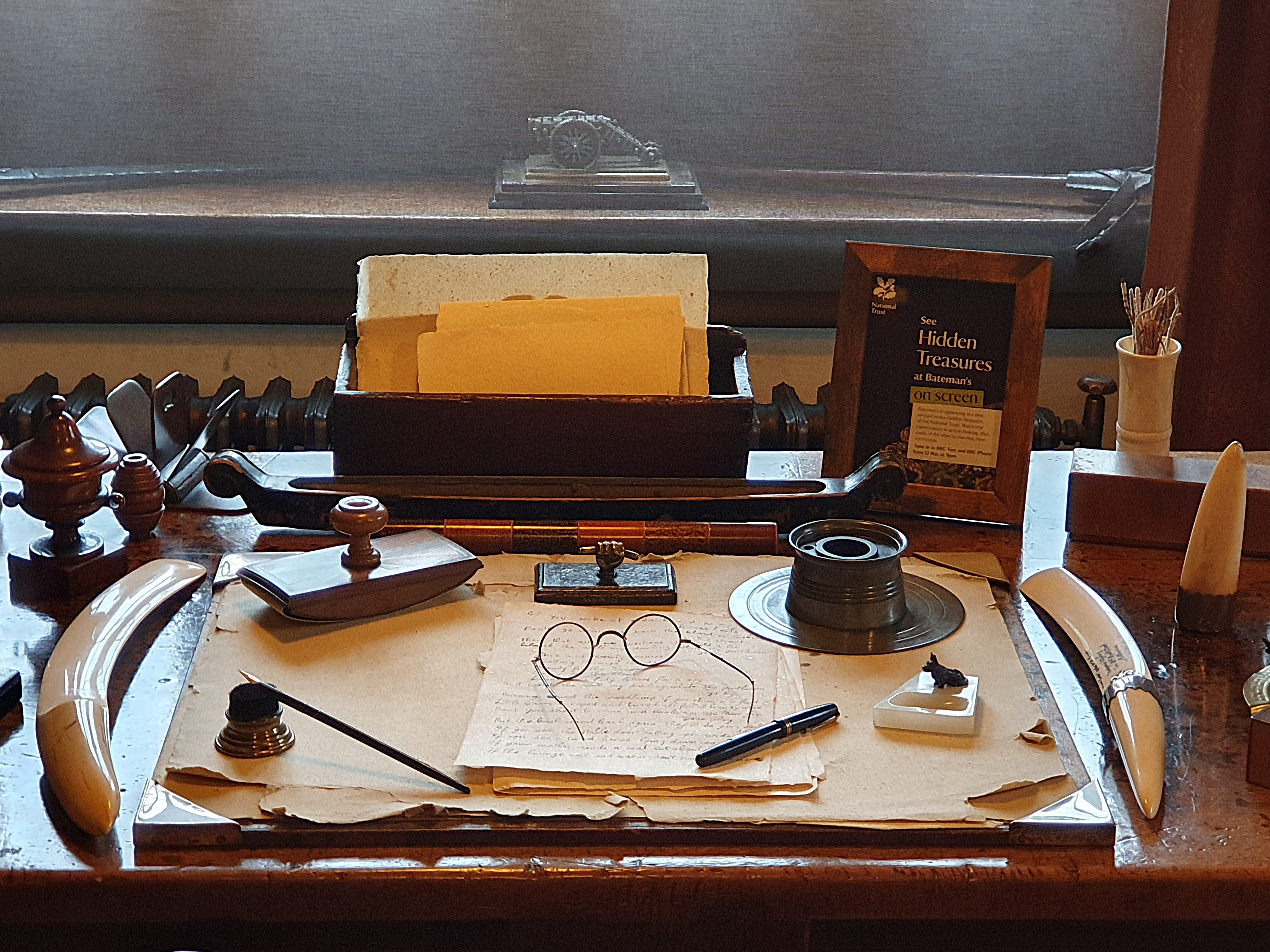 Schon die Eingangshalle mit ihrem dunklen, schweren Mobiliar bestätigt diesen Eindruck. Zwei Fensterluken über dem Kamin ermöglichten der Hausherrin Carrie, die eintretenden Gäste prüfend in Augenschein zu nehmen. Kiplings Arbeitszimmer liegt im ersten Stock. Wie zu seinen Lebzeiten ist der mächtige Schreibtisch aus Walnussholz „schrecklich überfüllt“, der Papierkorb quillt über von Manuskriptseiten. „Glücklicherweise war der einfache Akt des Schreibens immer ein körperliches Vergnügen für mich. Dies machte es einfacher, alles wegzuwerfen, was sich nicht richtig entwickelt hatte“, bekannte Kipling. Und vom Wegwerfen soll er ausgiebig Gebrauch gemacht haben.