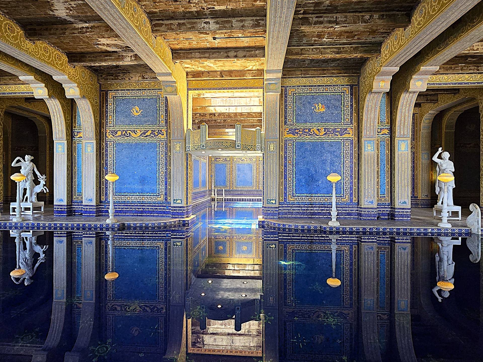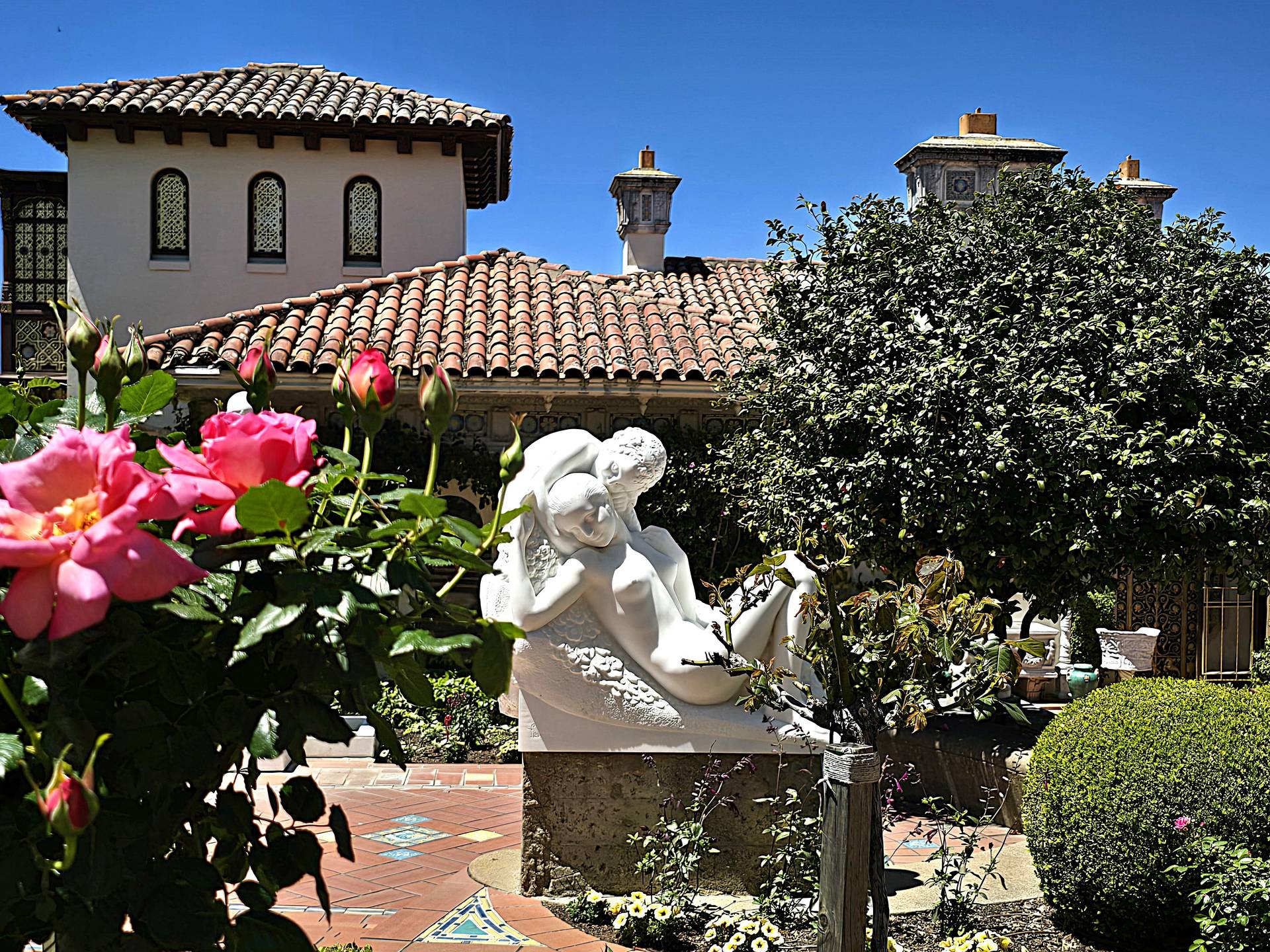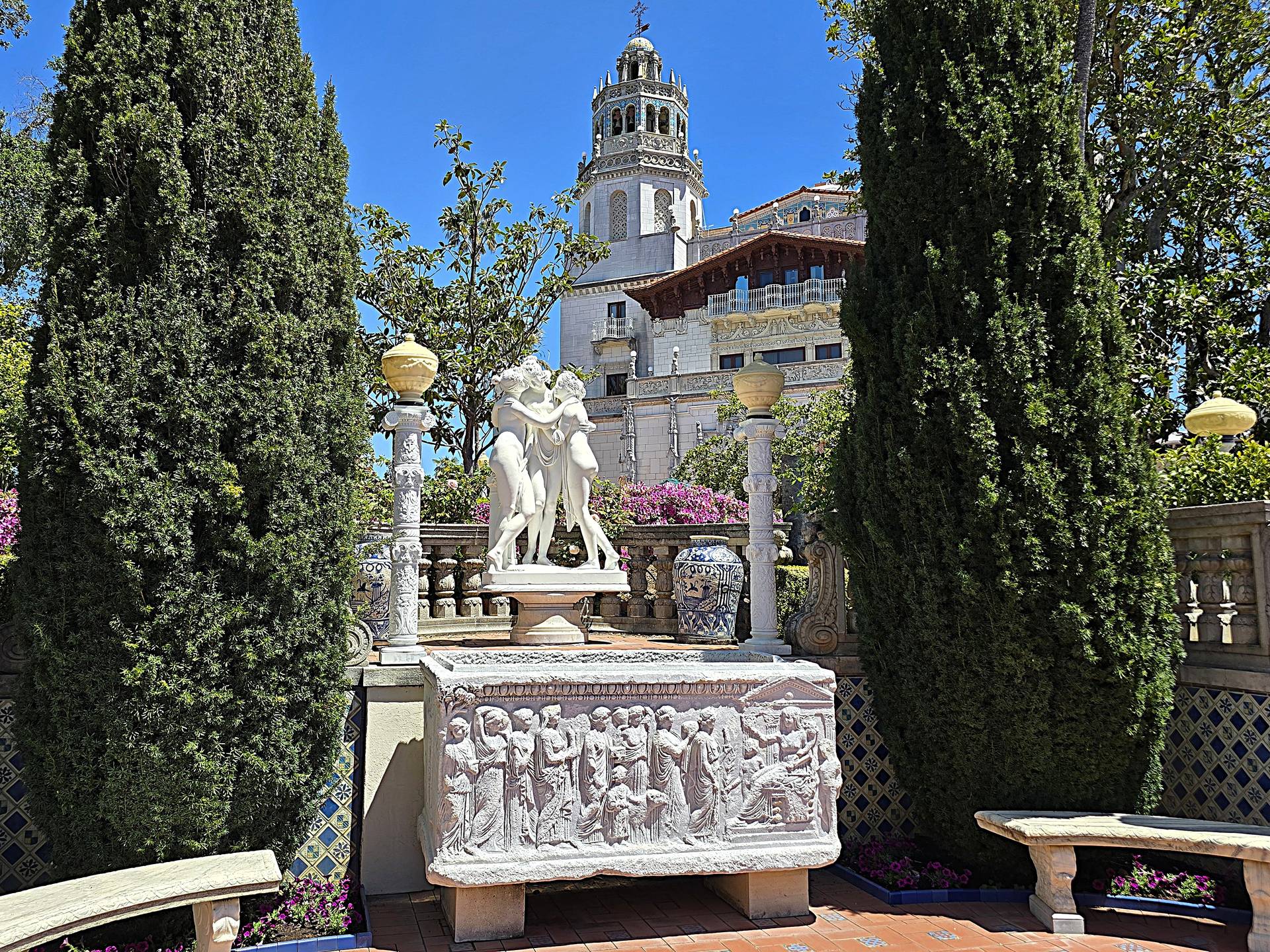 Die Fassade des Hauptgebäudes „La Casa Grande“, um das sich die Gästebungalows gruppieren, gleicht mit den beiden Glockentürmen und den Heiligenfiguren einer spanischen Kathedrale. Hier wie auch in den Innenräumen vermischen sich sakrale und profane Stilelemente zu einem irritierenden Konglomerat. Hearst hatte ganze Räume aus europäischen Schlössern, Klöstern und Palästen ausbauen und in seiner Privatresidenz wieder zusammensetzen lassen. Hinzu kamen jede Menge kostbare Gemälde, Tapisserien und Skulpturen, darunter auch Antonio Canovas „Italienische Venus“. Vermutlich haben die Eindrücke, die er als Junge auf einer Europareise mit seiner Mutter Phoebe gewonnen hatte, seine manische Sammelwut ausgelöst und befeuert. Und diese eklektische Anhäufung von Kunst und Antiquitäten wirkt auf den ersten Blick überwältigend, im Nebeneinander mit zeitgenössischen Imitaten und Kopien jedoch seltsam seelen- und konzeptlos.